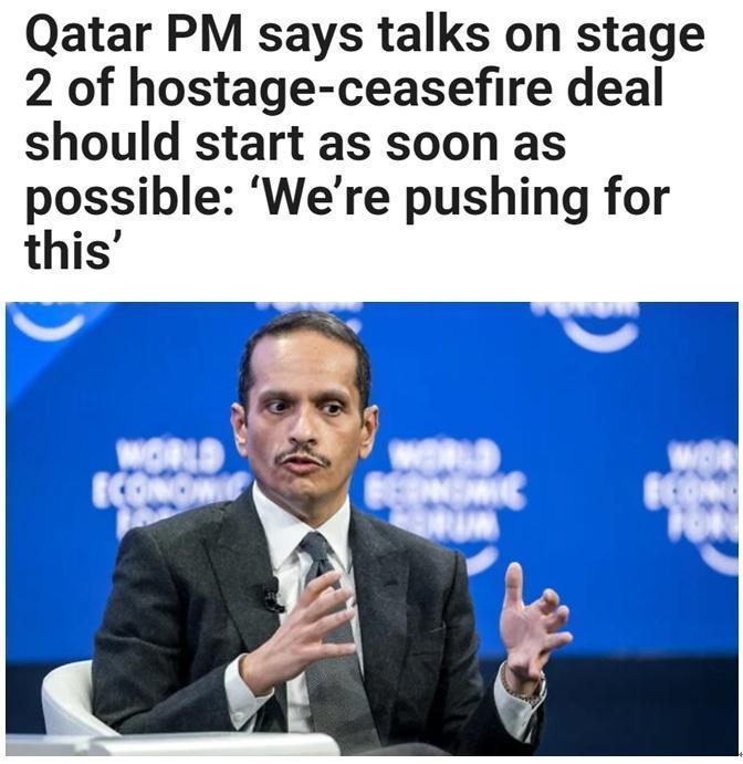 近日,在瑞士达沃斯出席世界经济论坛冬季年会的卡塔尔首相兼外交大臣穆罕默德表示,参考第一阶段停火谈判持续数月的情况,需要尽快就加沙地带停火和在押人员交换协议的第二阶段开始谈判。